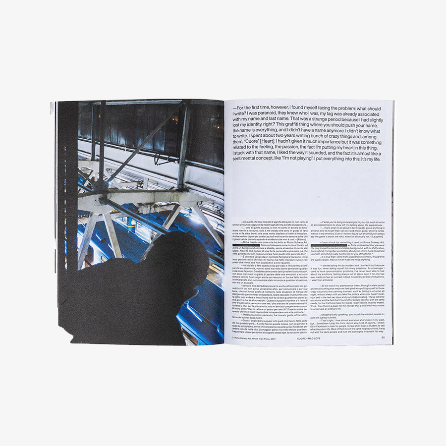 "For the first time, however, I found myself facing the problem: what should I write? I was paranoid, they knew who I was, my tag was already associated with my name and last name. That was a strange period because I had slightly lost my identity, right? This graffiti thing where you should push your name, the name is everything, and I didn’t have a name anymore. I didn’t know what to write. I spent about two years writing bunch of crazy things and, among them, 'Cuore'.—[Heart].—I hadn’t given it much importance but it was something related to the feeling, the passion, the fact I’m putting my heart in this thing. I stuck with that name, I liked the way it sounded, and the fact it’s almost like a sentimental concept, like 'I’m not playing'. I put everything into this. It’s my life".
