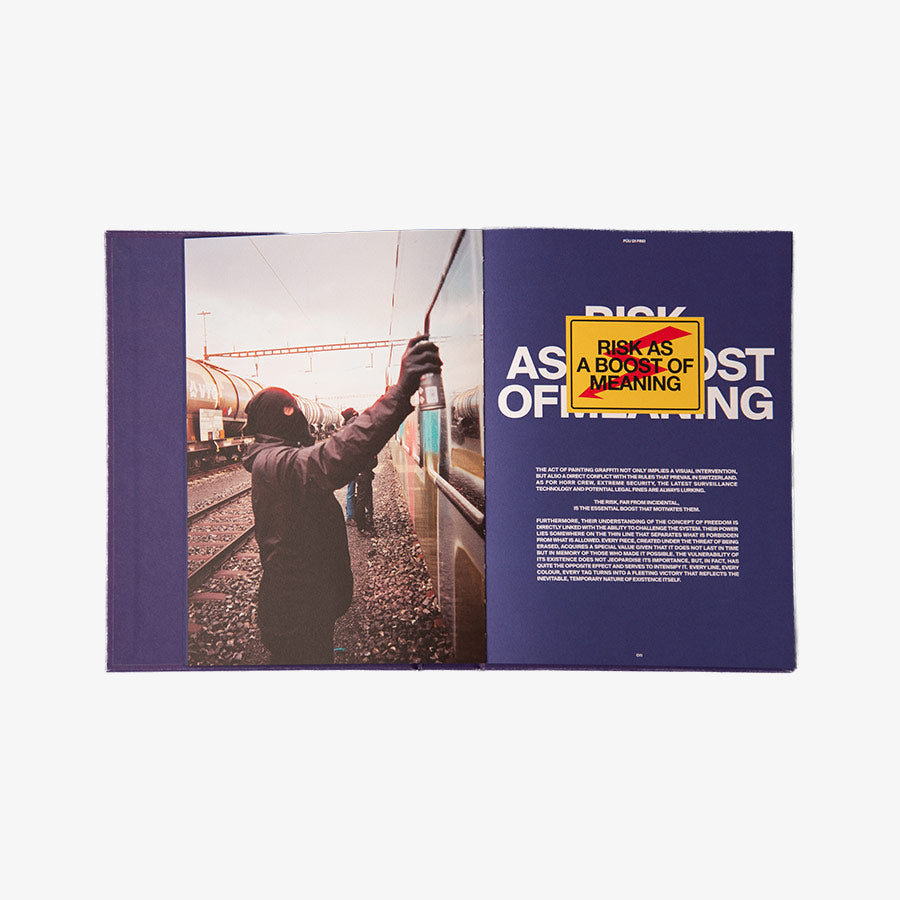 ‘Füu di Frei’ (Feeling Free) narrates the story of a group of writers whose connection transcends the ordinary. They share the same goal: to challenge the status quo. Their impulse for breaching barriers knows no limits, and it helps them face extreme situations, such as exploring train depots at -11ºC, going through mental breakdowns, and escaping from trains in motion. Their search for freedom redefines the limits and questions their sense of risk in an environment that demands continuous adaptation and resistance. In this context, the story reveals its Second Life, a B-side that confronts a judgemental society on those who think differently. It is by hiding their identity that the writers observe the daily routines from a whole new perspective and transform transgression into an act of authenticity that challenges the norm. ‘Adversity means defiance which translates into a deeper meaning of life. Even if it causes pain at times, it is essential that we cultivate hope and trust in our ambitions. Graffiti, more specifically train graffiti, means much more than aesthetics; it is a way of living and a passion that motivates us to achieve our goals, even if they may seem unreachable. It acts not only as an incentive for creativity but also works as a vehicle of resistance and expression day after day, fight after fight. Every intervention on the trains leaves a meaningful mark and symbolises a personal and collective journey in search for recognition and authenticity.’ Mark Madness. ‘Füu di Frei’ represents the beginning of a unique project that combines videography and photography and that turns it into a creative dialogue never seen before. The audience now has the chance to get to the heart of the narrative through an exclusive book, while the short movie is still under construction to offer the best possible quality. This format serves as a prelude that makes it possible to explore the story in depth and appreciate details that enrich the narrative. First, the book; then, the short movie, which will transform the audience’s imagination into a moving reality. The book is not just a complement, but also a key piece of the project, and it is being launched as a limited edition with exceptional editorial and graphic design by Ana Baenas. Her work, which stands out because of her creativity and attention to detail, shows a level of quality that elevates this publication into a unique collectable object. Every piece is exclusive, turning it into a symbol of this creative adventure. Pre-ordering is now open and gives you the opportunity to claim your copy before it sells out. Throughout the creation of ‘Füu di Frei’, the author has worked with a series of techniques that break the limits of visual narrative. His inseparable Olympus MJU I has been key to capturing the most meaningful moments of the process, turning the duality of approaches into a rich and multifaceted experience. This project not only aims to tell a story but also to connect with an audience that knows how to appreciate art, audiovisual narrative and exclusive design. By supporting this project you’ll be part of its production and contributing to something that redefines how multiple formats manage to coexist to tell a story. Limited edition 500 copies Content: Over 250 pages Prologue by RosyOne & Still Alive Language: English Format: 17 x 24cm closed / 34 x 24cm open Interior: Full color (4 + 4) / Classic Rough 120 gsm paper Endpapers: 4 + 0 colors / Classic Rough 150 gsm paper Cover: 4 + 0 colors with dry stamping (14x14cm) / Geltex White Silk 125 gsm paper Binding: Swiss binding with exposed thread and painted edges on all three sides Board: 2.5mm thick cardboard