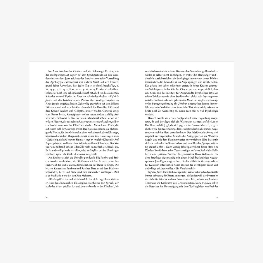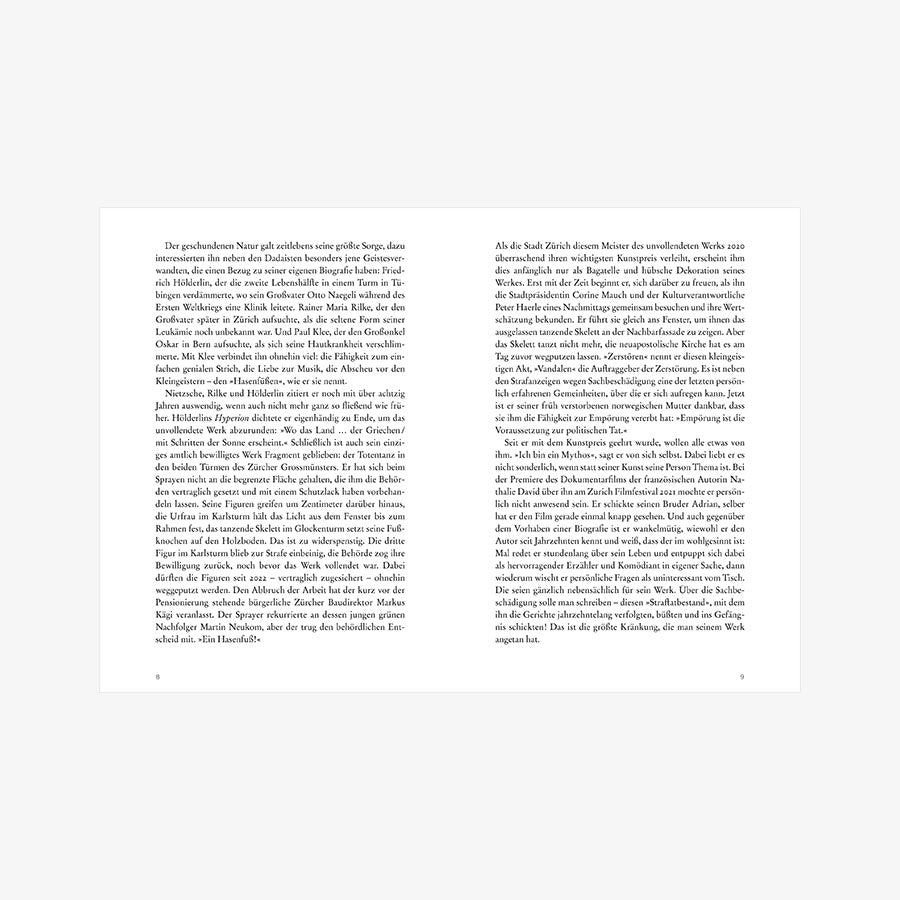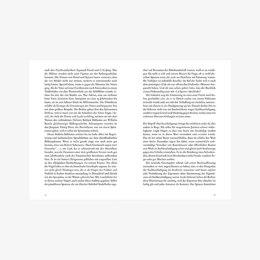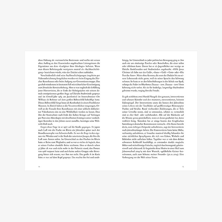 Harald Naegeli, Mensch voll Poesie, Künstler voll Liebe zur Natur und Kämpfer für die Utopie und das Museum auf der Straße. Diese Biografie erzählt über Leben und Schaffen des introvertierten Zeichners, der an seinen »Urwolken« im Großformat über Jahre nur einzelne Striche ergänzt, sowie den extrovertierten Sprayer und politischen Dadaisten, der in wenigen Sekunden Hauswände aufwertet – denn mit dem Begriff »Sachbeschädigung« kann er überhaupt nichts anfangen.