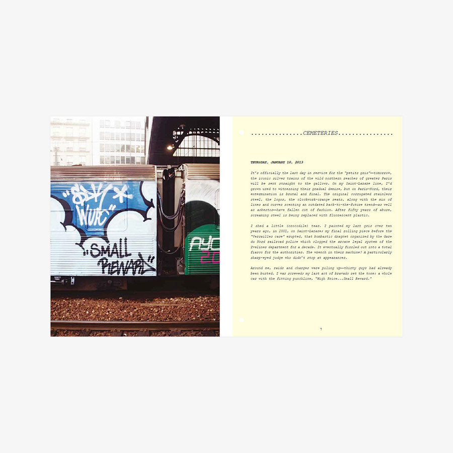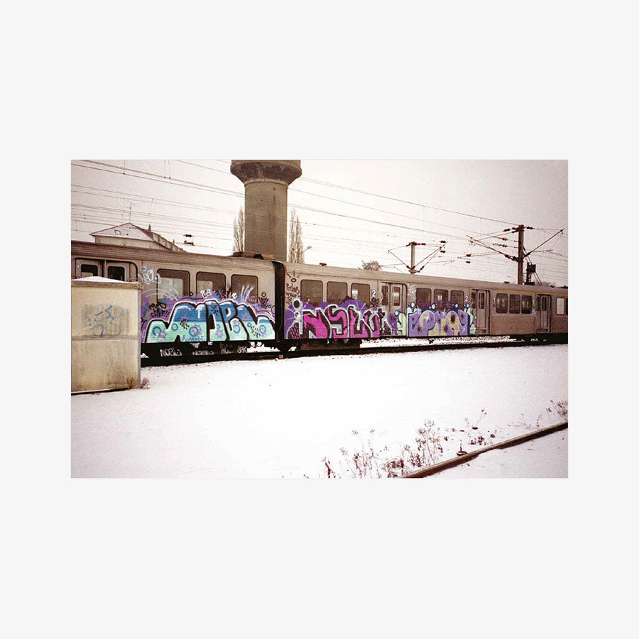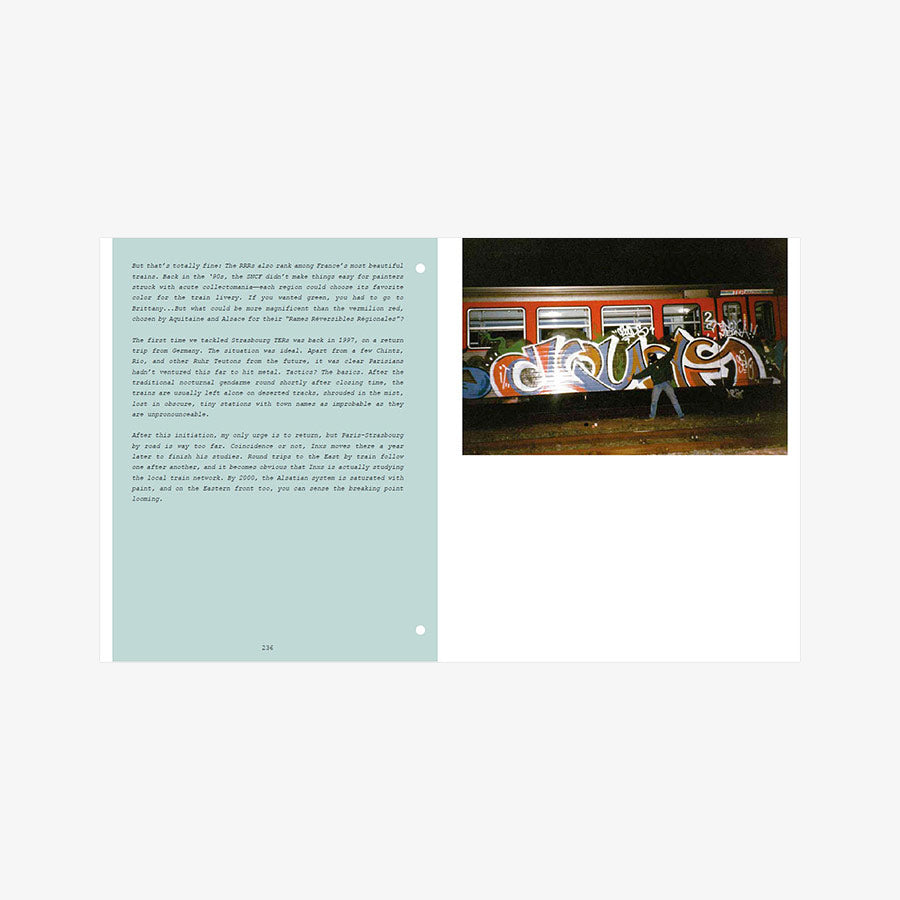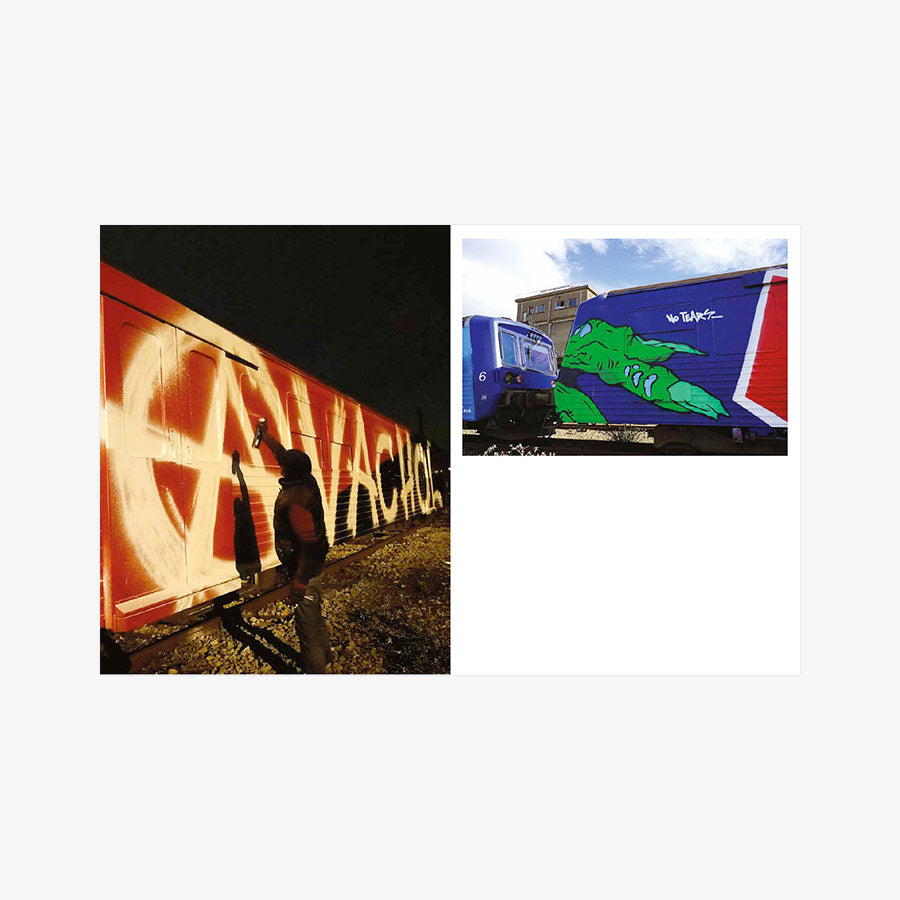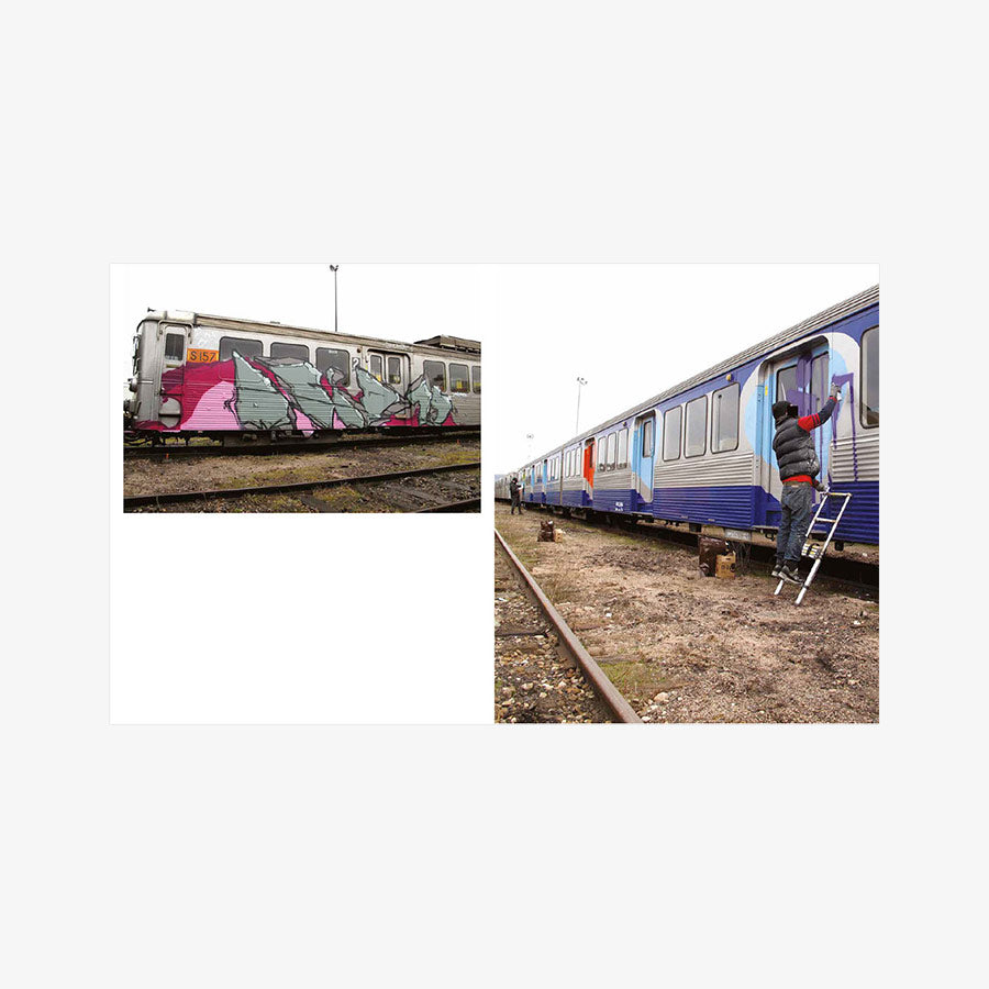 2001. After a decade of railway graffiti, Opak and the SDK crew stop painting trains in France, caught up in the legal system. Twelve years later, SNCF accelerates the scrapping of the country’s most beautiful trains and officially announces the death of the famous “petits gris.” That’s the trigger—Opak goes on a quest to paint all these legendary trains one last time. In the form of a logbook, Olivier Scuro reveals in the first volume of Painted Graves the details of this adventure and its origins in the 1990s, through numerous archive photos showcasing the works of Opak, Inxs, Honet, Pum, Fancie, Riot, Sime, Milk, Poes, Chill, Acid79, Skeme—to name just a few. A bit of urbex and adrenaline, some nostalgia... and above all, a lot of graffiti. 300 pages, text in English and French.