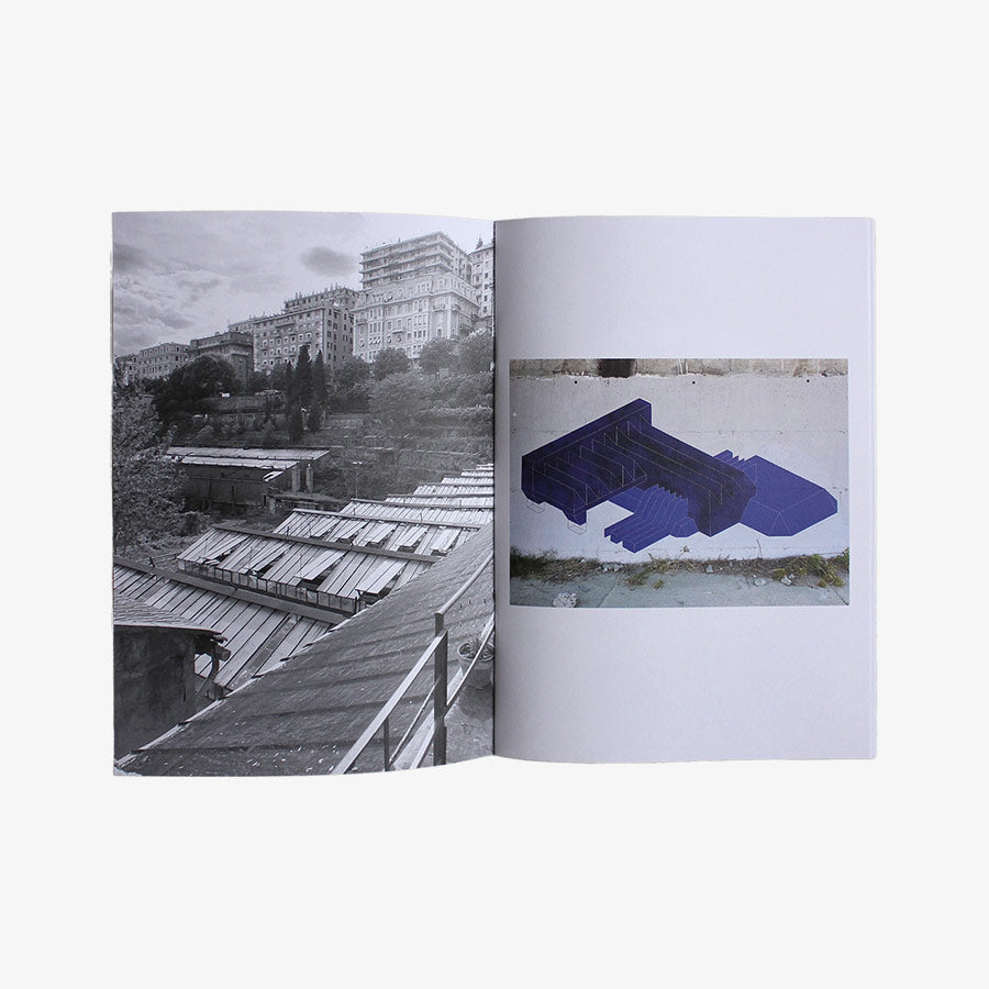 Italian artist 'Zero Fluido' paints minimalistic wireframe models at abandoned buildings, mostly in the Genova area. Structures of buildings, bridges and roofs, all serve as inspiration. Zero manages to minimize this input, both in color and form. The zine includes a series of inspirational images, as well as the final artworks which leave the viewer with a sense of alienation.