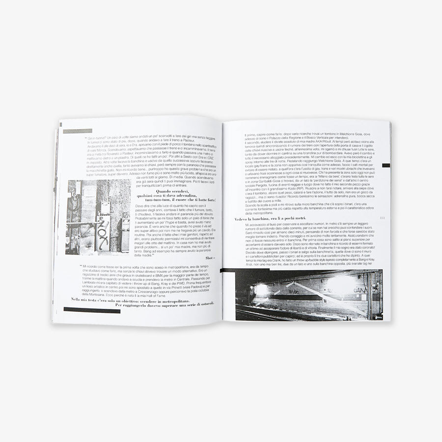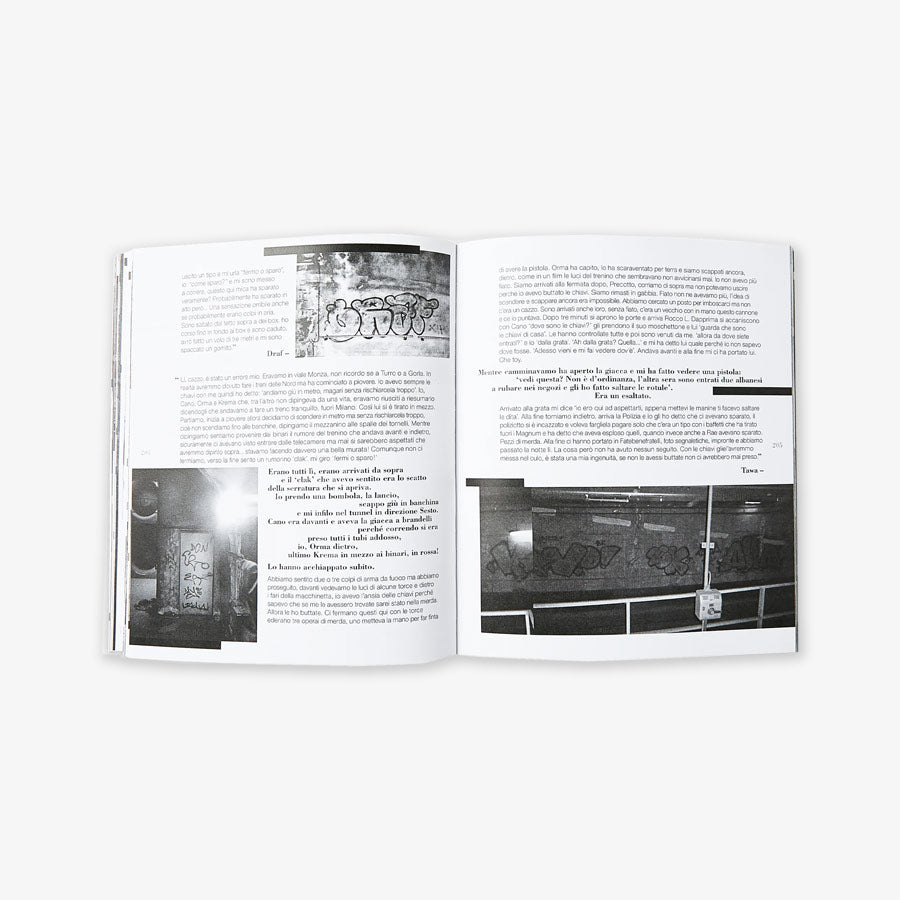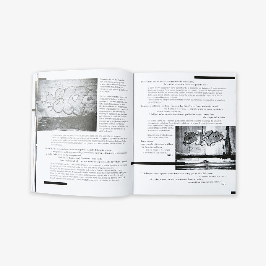 Buio Dentro is a foray into the darkest side of Milanese graffiti, the bad side, the side that has nothing to do with the quiet Sundays in the Hall of Fame nor with the street artist of the moment. In the Instagram era, Corrado Piazza stops time and brings back to life the golden age Milan, exhuming from the subway manholes the most important names of the Milanese scene from 1987 to 1998. An incredible collection of images and testimonies, mostly unpublished, from the voice of those who lived those years and never forgot them. Without filters, without censorship. Unlike the countless publications that preceded it, Buio Dentro focuses exclusively on bombing the subsoil, in that network of tunnels that constitutes the metropolitan network of Milan. A romantic project that aims to tell, in the most complete and reliable way, the roughest face of an unforgettable and unrepeatable season of aerosol writing in Milan.