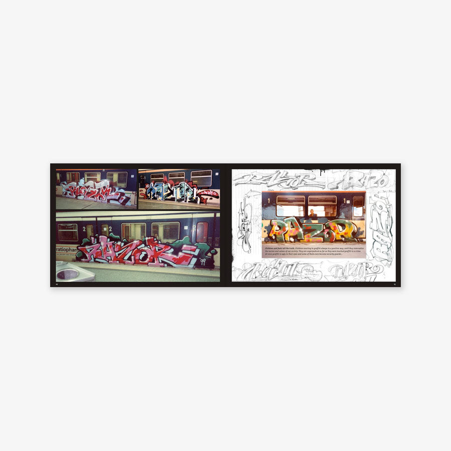 In every phase of his busy career, he has managed to stand out from the great mass of writers and to constantly raise the bar in terms of quality. The output of his first two decades was still to be found in classic stylewriting, but in recent years he has expanded his repertoire to include conceptual works such as his ICE project. RAZOR - COLORS ON STEEL is structured like a blackbook and has a very personal character. He himself opens the book with the following words: