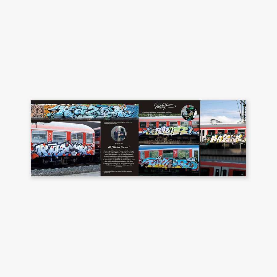 RAZOR is and remains an exceptional phenomenon when it comes to graffiti on trains – worldwide and across all generations! For more than 30 years now, he has been playing his colourful game – mainly in the yards of his home in northern Germany, but trips across the nation and Europe have also been documented in this book.